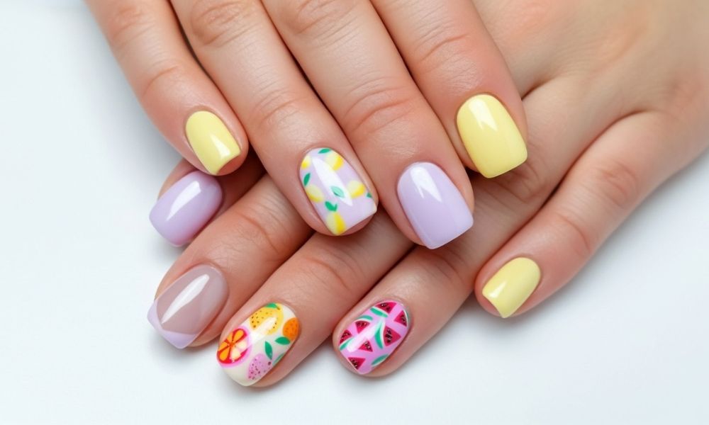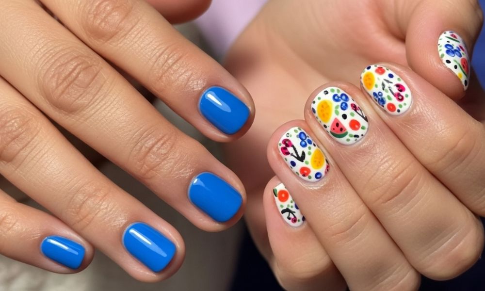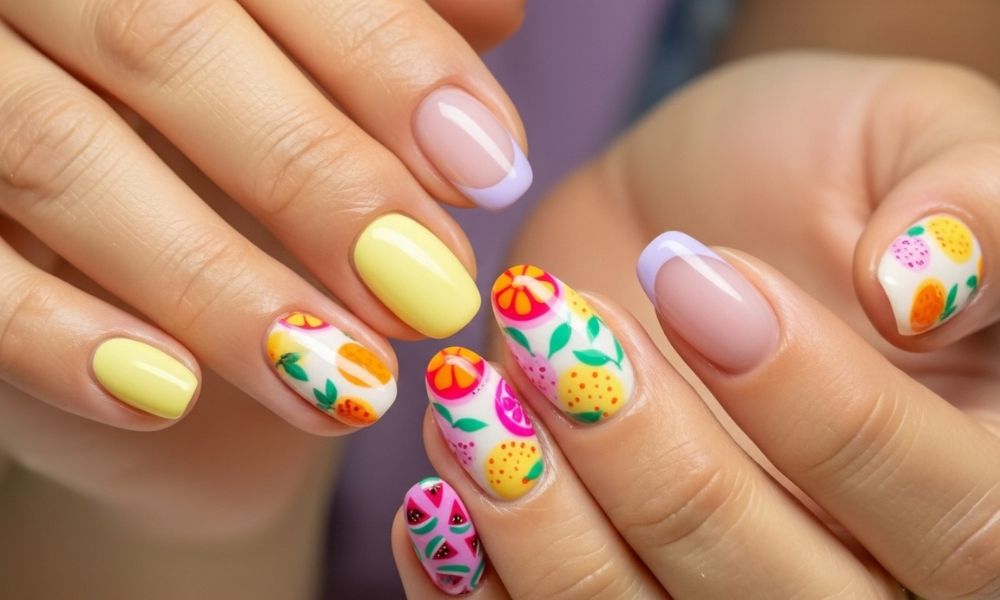 Color Tip: Mix complementary fruit tones (like lime green with pink or orange with violet) for that Instagram-worthy nail combo.